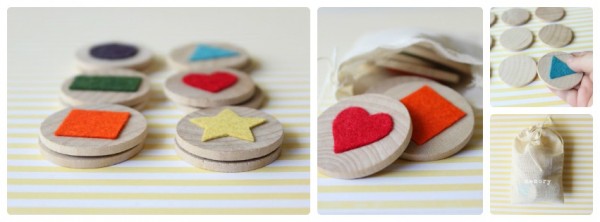 Il mio preferito: un memory fatto con dischetti di legno e feltro colorato: un trionfo di forme e colori e una meravigliosa semplicità! Creato da Dandee designs (anche foto in alto)